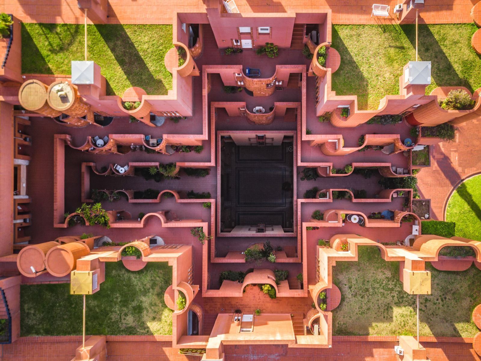Giếng trời nằm chính giữa tòa nhà như mở một khoảng không của nắng và gió. Ban đầu, công trình được bao phủ bằng gạch gốm màu xanh nhưng chúng đã bị loại bỏ vào năm 1995. Gạch đỏ sau đó trở thành vật liệu chính của tòa nhà.