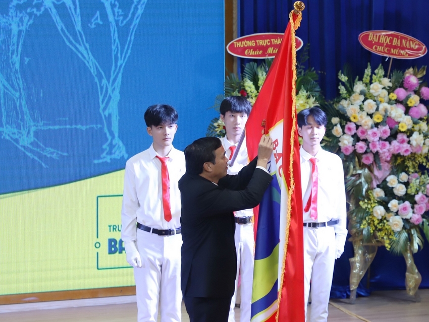 Đồng chí Lê Trung Chinh - Phó Bí thư Thành ủy, Chủ tịch Ủy ban Nhân dân thành phố Đà Nẵng gắn Huy chương Độc lập hạng Nhì lên cờ truyền thống của Trường