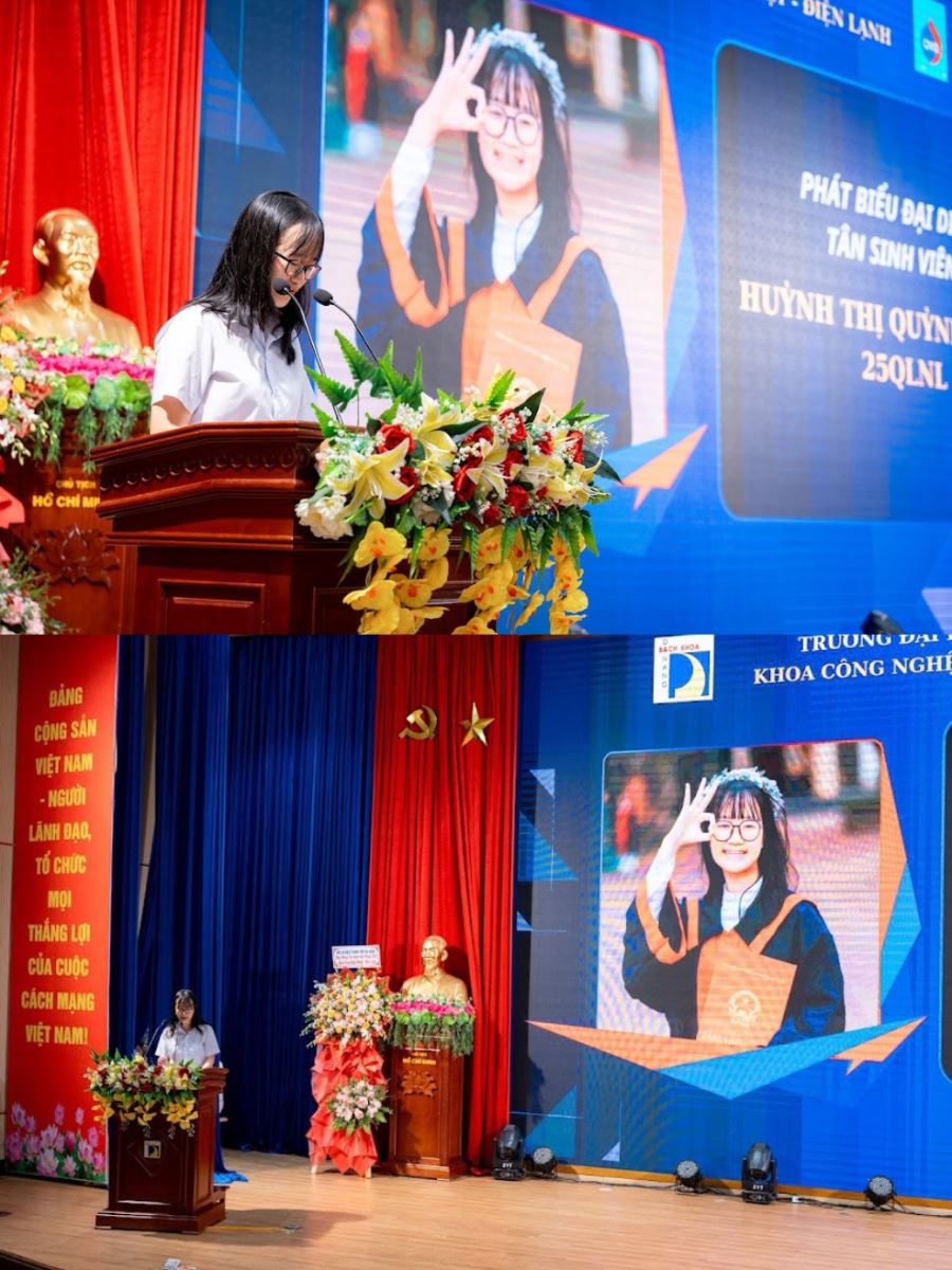 Đại diện cho hơn 187 tân sinh viên, bạn Huỳnh Thị Quỳnh Trang lớp 25QLNL, thủ khoa đầu vào của chuyên ngành mới mang tên “Quản lý năng lượng” đã vinh dự phát biểu cảm nghĩ trong buổi lễ trang trọng này. Với sự tự hào khi đặt chân vào khoa Công nghệ Nhiệt - Điện lạnh, bạn đã gửi lời cảm ơn đến các doanh nghiệp và thầy cô đã luôn quan tâm, hỗ trợ từ những bước chân đầu tiên trên giảng đường đại học. Đồng thời là lời hứa sẽ nỗ lực phấn đấu hết mình trong suốt quá trình học tập và rèn luyện sắp tới.