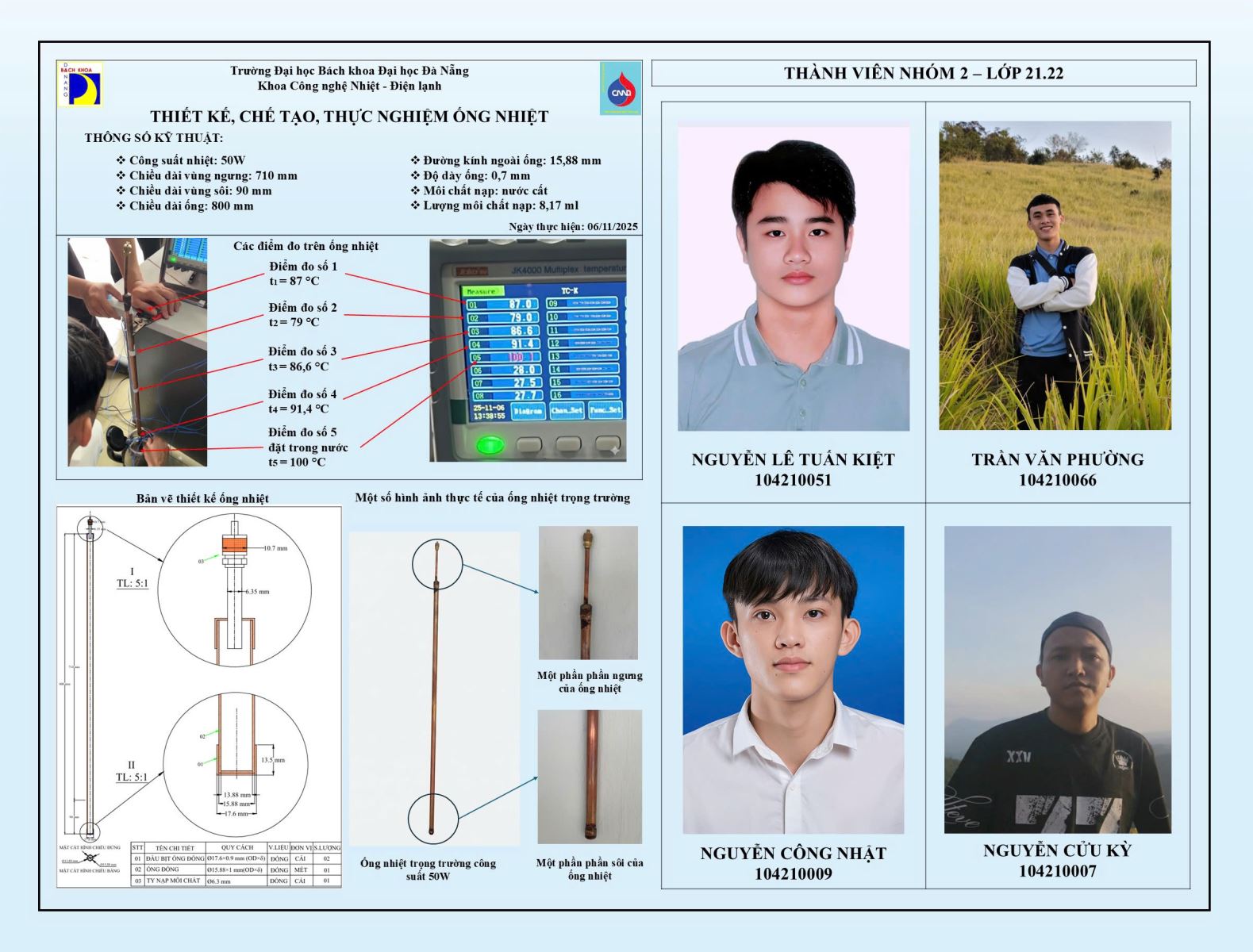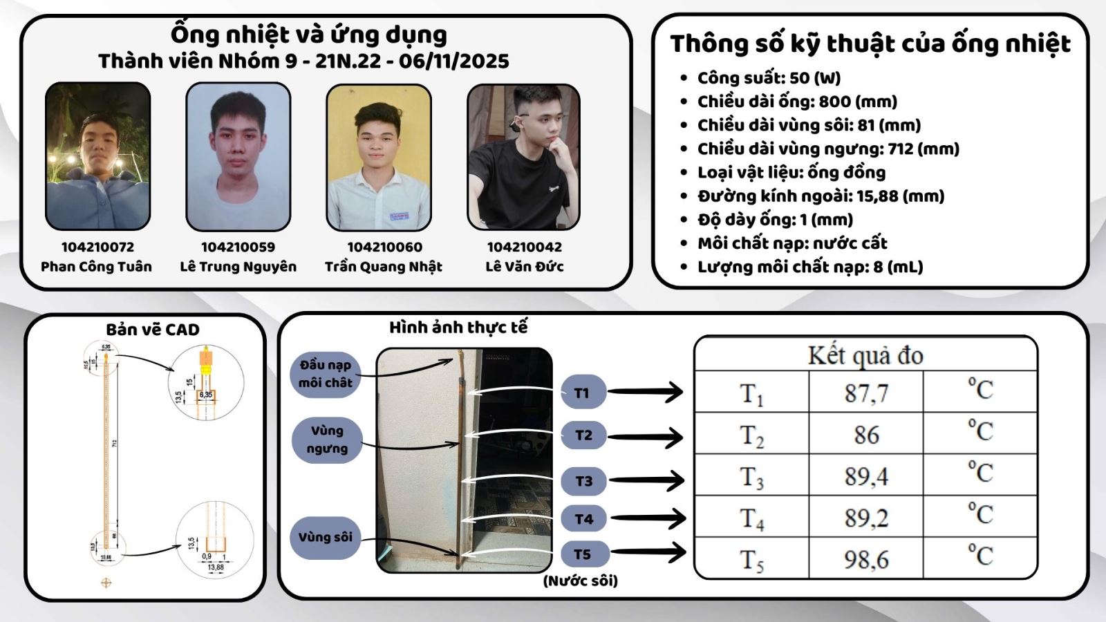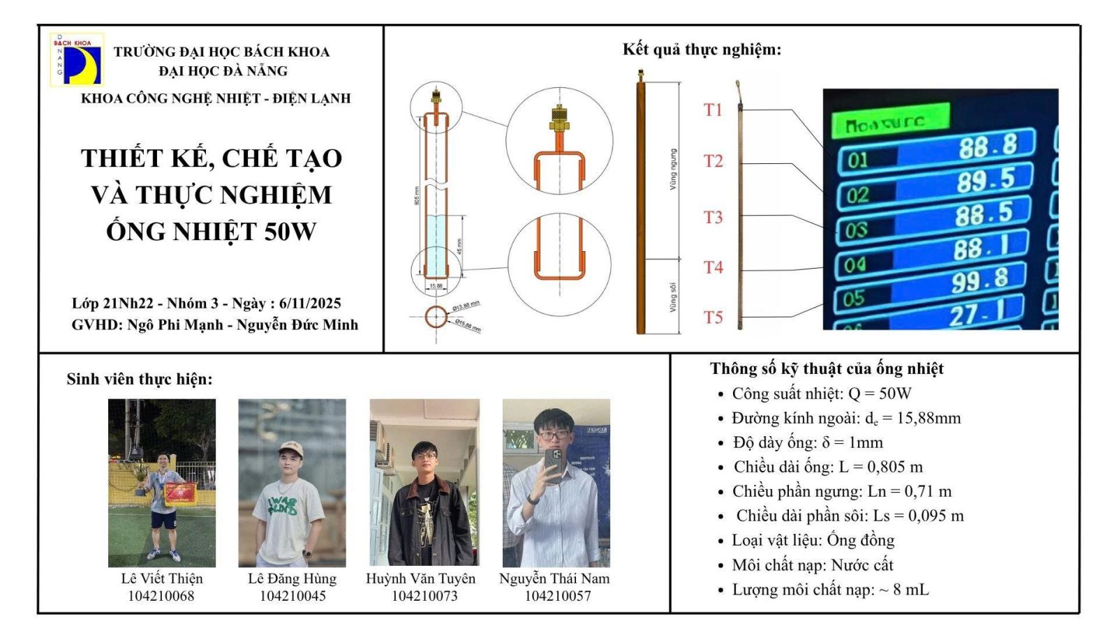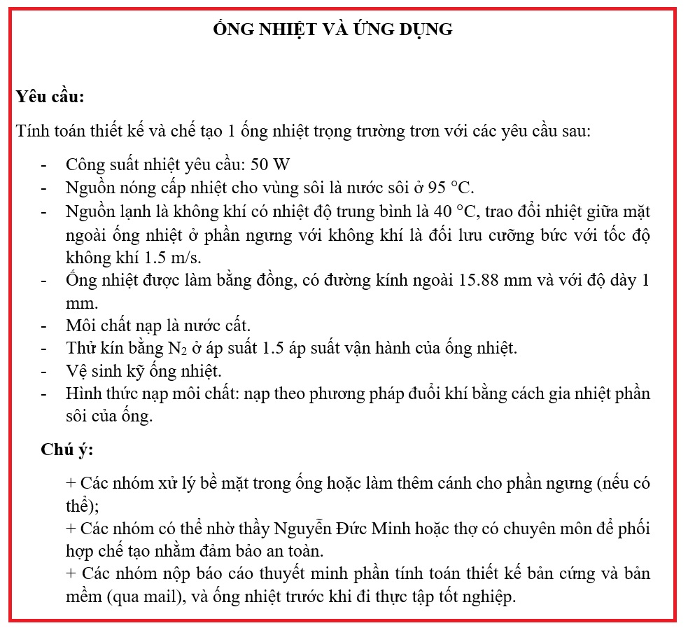 Trong khuôn khổ học phần Ống Nhiệt và ứng dụng tại khoa công Nghệ Nhiệt - Điện lạnh, những sinh viên thuộc khóa 21 của khoa đã tiếp nhận nhiệm vụ được giao của giảng viên TS. Ngô Phi Mạnh về việc tính toán thiết kế, chế tạo và thực nghiệm 1 ống nhiệt có các thông số yêu cầu sau: