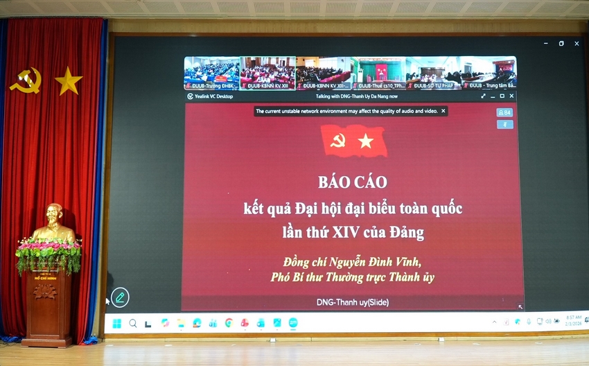Sáng ngày 03/02/2026, Đảng bộ Trường Đại học Bách khoa, Đại học Đà Nẵng (ĐHĐN) đã tham dự Hội nghị trực tuyến sinh hoạt chính trị chào mừng kỷ niệm 96 năm Ngày thành lập Đảng Cộng sản Việt Nam (03/02/1930 - 03/02/2026) và thông báo nhanh kết quả Đại hội đại biểu toàn quốc lần thứ XIV của Đảng.