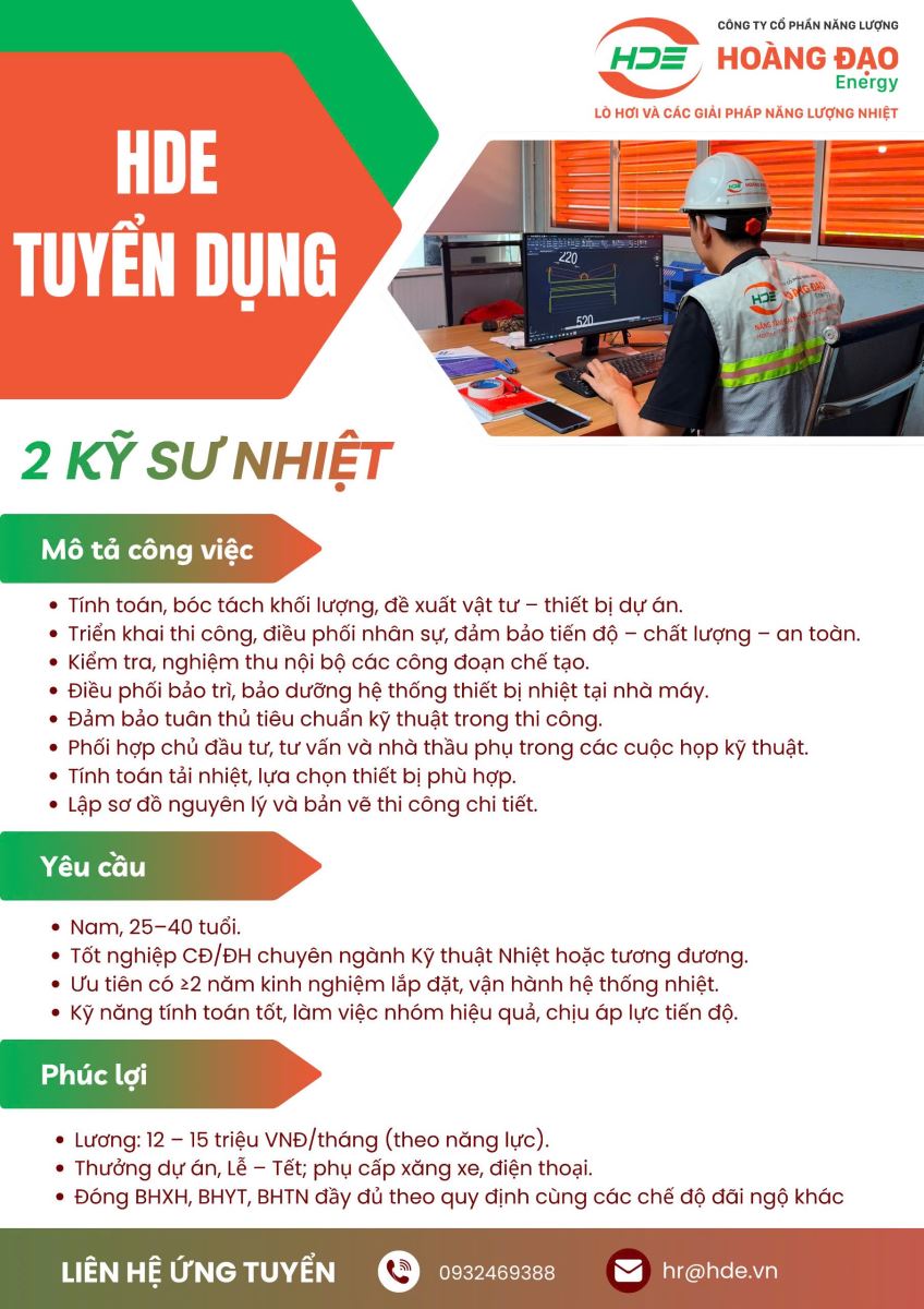 Thông tin tuyển dụng kỹ sư Nhiệt từ công ty cổ phần Năng lượng Hoàng Đạo (HDE)