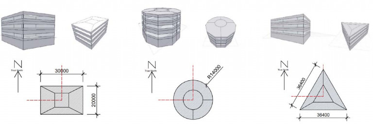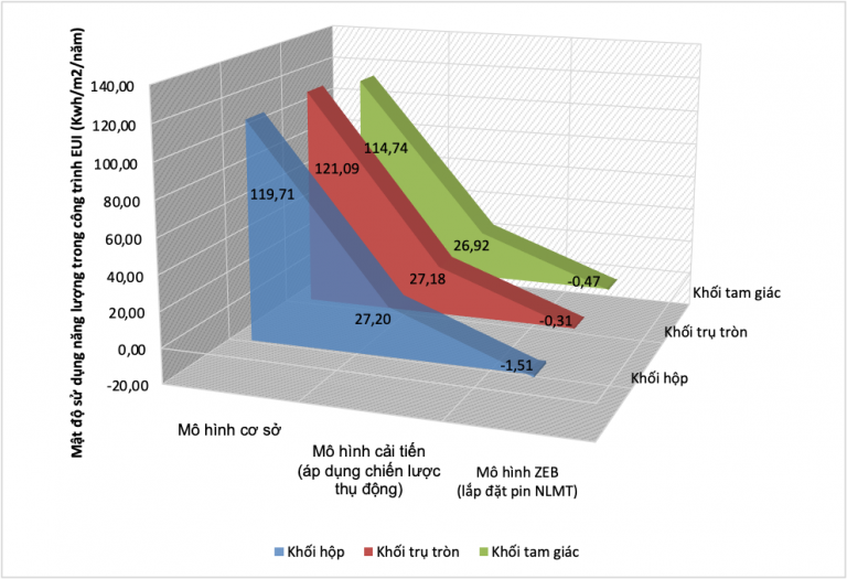 Ba khối mô hình cơ sở cho ra kết quả suất tiêu hao năng lượng (Energy Use Intensity – EUI) của công trình là: EUI Khối hộp = 119,71 kWh/m2/năm; EUI Khối trụ tròn = 121,09 Wh/m2/năm; EUI Khối lăng trụ tam giác = 114,74 kWh/m2/năm. Kết quả này đã được thực hiện cân chỉnh mô hình tương đương với chỉ số trung bình năng lượng các tòa nhà văn phòng toàn quốc EUItb = 112,39 kWh/m2/năm, tương tự kết quả báo cáo của Chương trình năng lượng sạch Việt Nam (VCEP) [5]. Cách tiếp cận này có thể tìm thấy trong nhiều nghiên cứu khác như của Zheng và Weng [6] hay Huang và Gurney [7].