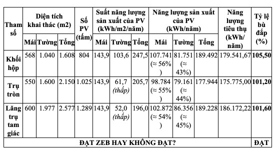 Sau khi thực hiện mô phỏng trên EnergyPlus, kết quả cho thấy việc lắp đặt tấm PV mặt đứng đem lại hiệu suất thấp hơn hẳn so với đặt PV mặt mái, đặc biệt là PV mặt đứng khối trụ tròn và lăng trụ tam giác (xem bảng kết quả). Vì vậy khi thiết kế ZEB, giải pháp lắp đặt PV nên được nghiên cứu ngay từ đầu nhằm kiểm soát diện tích mái công trình thuận tiện cho phương án lắp đặt.