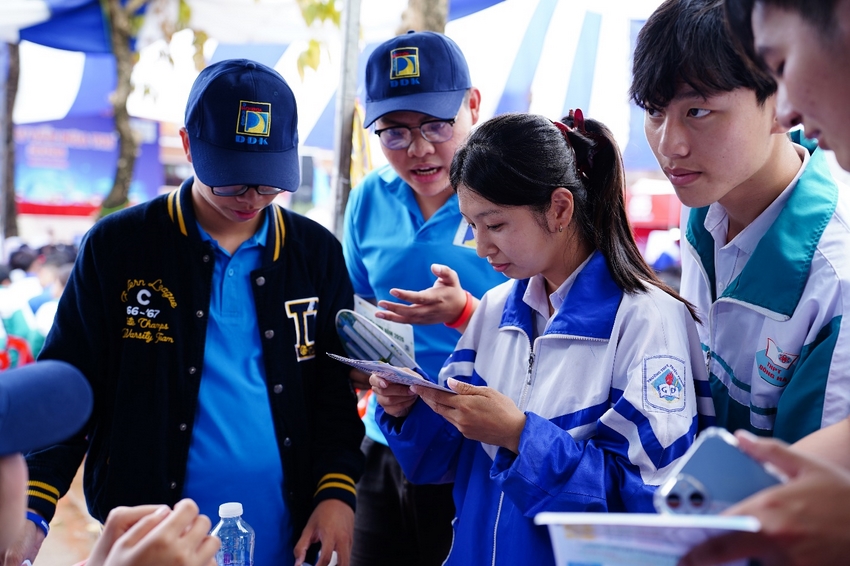 Khu vực tư vấn của Nhà trường thu hút đông đảo học sinh ghé thăm với không khí sôi nổi. Nhiều hoạt động giao lưu, minigame và check-in nhận quà đã tạo cơ hội để các em tìm hiểu rõ hơn về môi trường học tập năng động tại Trường Đại học Bách khoa, ĐHĐN - nơi được xem là “trái tim công nghệ của miền Trung”.