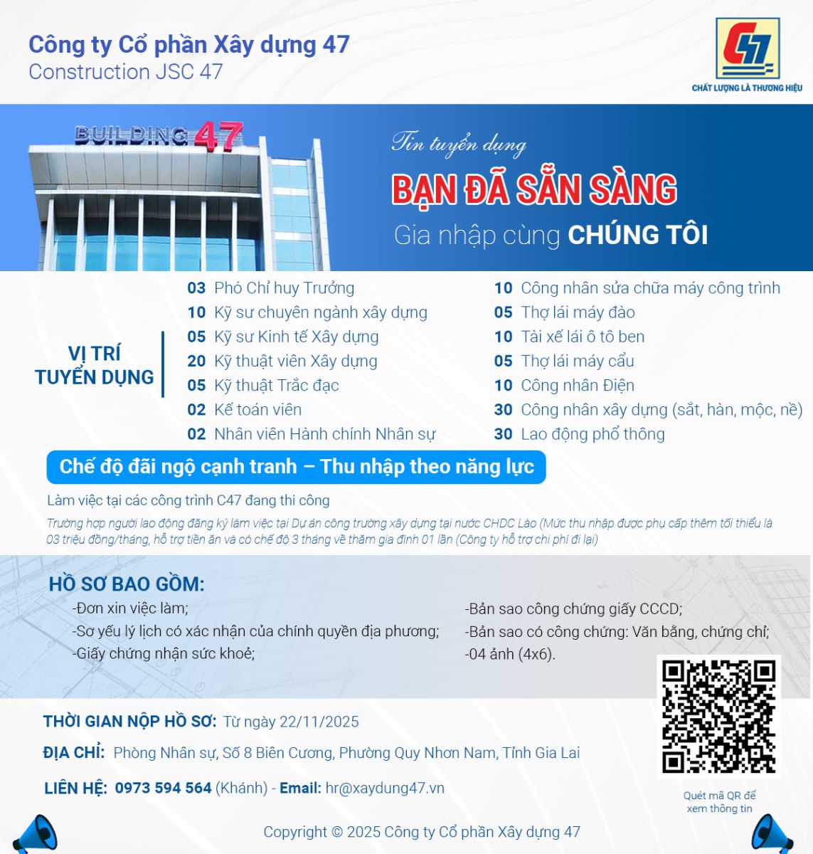 Công ty Cổ phần Xây dựng 47 thông báo tuyển dụng: