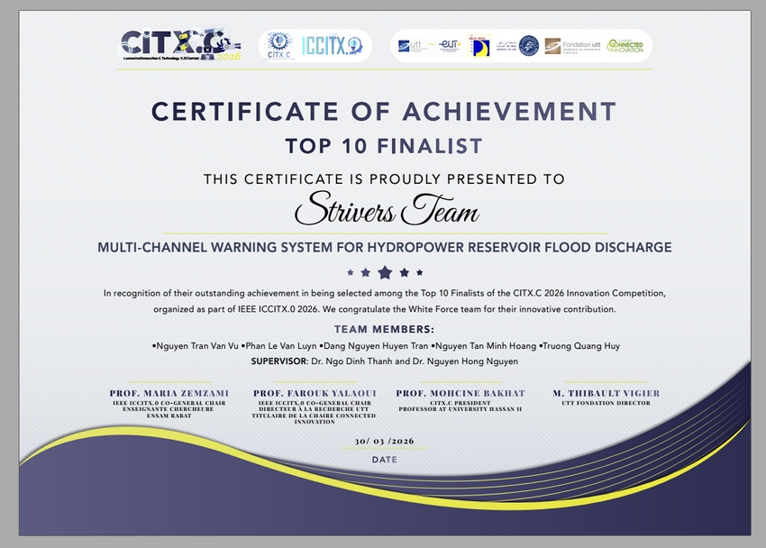 - Strivers Team với đề tài “Multi-channel Warning System for Hydropower Reservoir Flood Discharge”, thuộc lĩnh vực công nghệ công nghiệp và an toàn hạ tầng, dưới sự hướng dẫn của TS. Ngô Đình Thanh và TS. Nguyễn Hồng Nguyên.