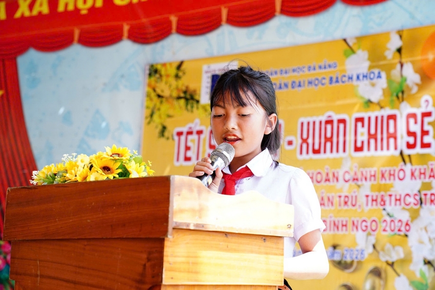 Thay mặt các em học sinh Trường Phổ thông Dân tộc bán trú TH&THCS Trà Vân, em Hồ Nguyễn Trà My đã xúc động bày tỏ lời cảm ơn chân thành tới các thầy cô Trường Đại học Bách Khoa, ĐHĐN. Em chia sẻ, “những phần quà Tết tuy giản dị nhưng chứa đựng sự quan tâm, yêu thương và động viên rất lớn, giúp các em học sinh vùng cao còn nhiều khó khăn của tụi em có thêm niềm vui, sự ấm áp và động lực để đón một mùa xuân mới trọn vẹn hơn. Sự quan tâm của nhà trường không chỉ mang ý nghĩa vật chất mà còn là nguồn khích lệ tinh thần quý báu, tiếp thêm niềm tin và hy vọng cho chúng em trên con đường học tập phía trước.”